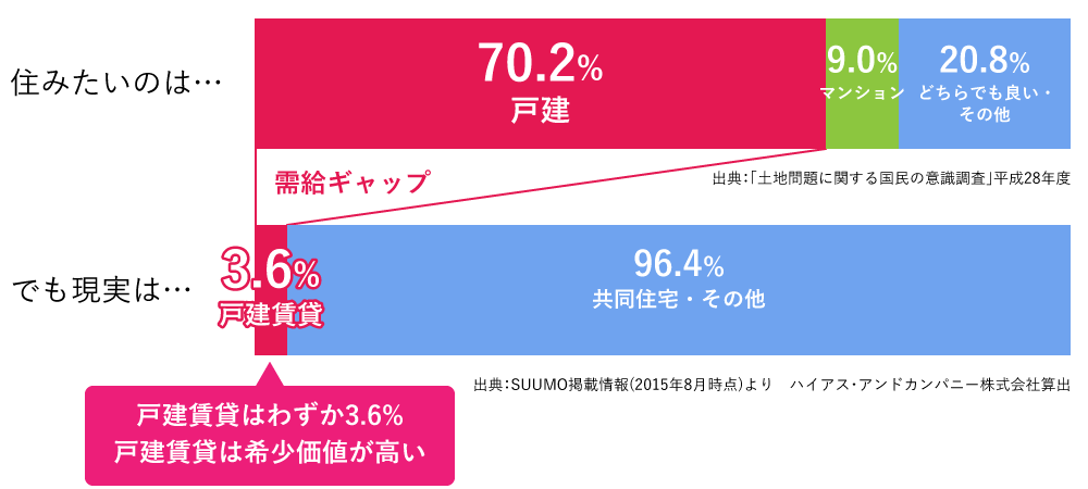 人口減少等により、日本では「空き家問題」が叫ばれて久しくなりました。しかし住まいを求める人の声を詳しく分析すると「できれば戸建てに住みたい」という方は、7割以上。一方賃貸市場で戸建の供給量は、全体の3.6%しかありません。つまり、空き家増加傾向にあっても、戸建賃貸は供給が足りない状況なのです。